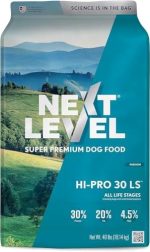 Next Level Hi-Pro 30 LS is a super premium dry dog food designed for active and working dogs that need high-protein fuel to thrive. With 30% protein and 20% fat this nutrient-dense kibble supports muscle strength endurance and sustained energy throughout the day. Made with beef meal as the first ingredient this formula delivers concentrated animal protein to help maintain lean body mass and peak performance. It’s fortified with essential vitamins and minerals to promote overall health and vitality and made without corn wheat soy gluten or artificial additives. Produced in an SQF-certified facility with responsibly sourced ingredients Hi-Pro 30 LS is a high-performance choice for dogs that go the extra mile.