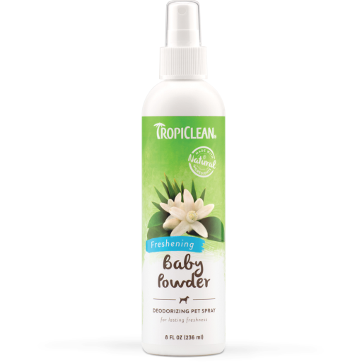 TropiClean Deodorizing Pet Spray conditions and soothes as it breaks down bad smells at their source effectively refreshing your dog cat and home. The light scent of baby powder leaves your pet smelling fresh and ready for cuddles!